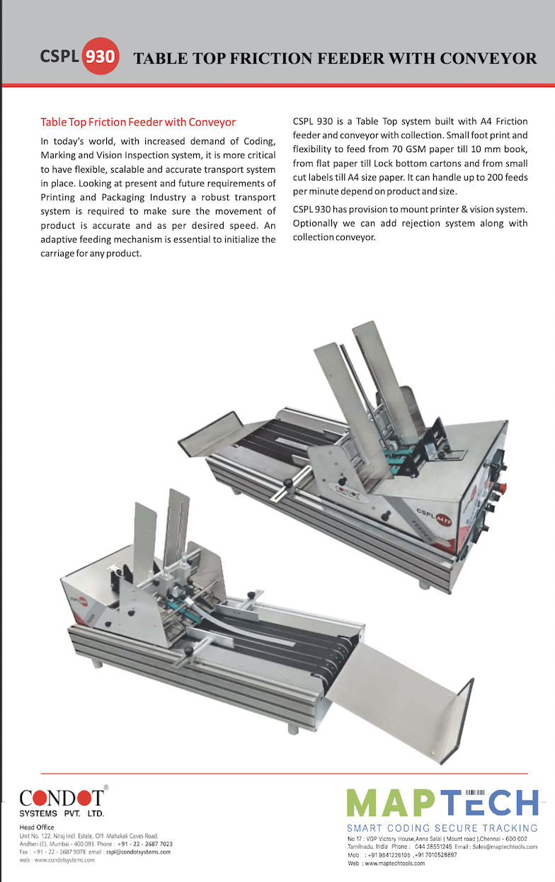CIPL A4 FF is a friction feeder designed to feed a minimum of 40×60 mm up to 300×300 mm and maternal ranging from 70 gsm paper to 10 mm booklets depending on the type of material It has the capability to feed up to 30000 PP (Feeds per hour) 80 meters/min. The friction feeder is automatic machine for feeding and dispersing fiat products that can be placed with the highest precision at a selected point. The structure is entirely in stainless steel and this makes it ideal for catering the applications inFood, Pharma and Packaging lines